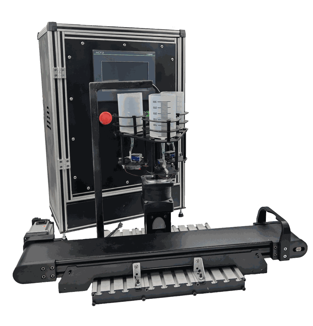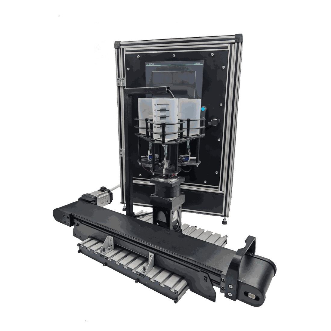 Учебный стенд «Цифровой электропривод» представляет собой программируемую установку для образовательных целей, выполненную в надёжном корпусе и оборудованную тремя мерными ёмкостями для точного дозирования и распределения жидкостей в контейнеры. Кроме того, в систему внедрена конвейерная линия, обеспечивающая автоматизированное перемещение контейнеров.